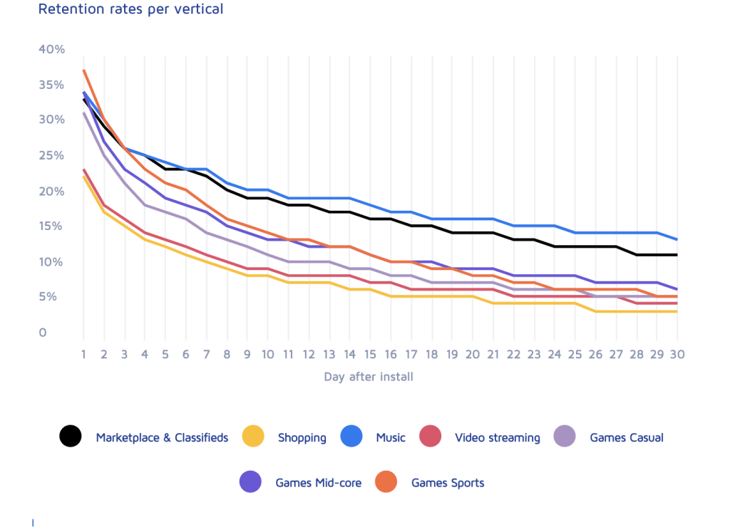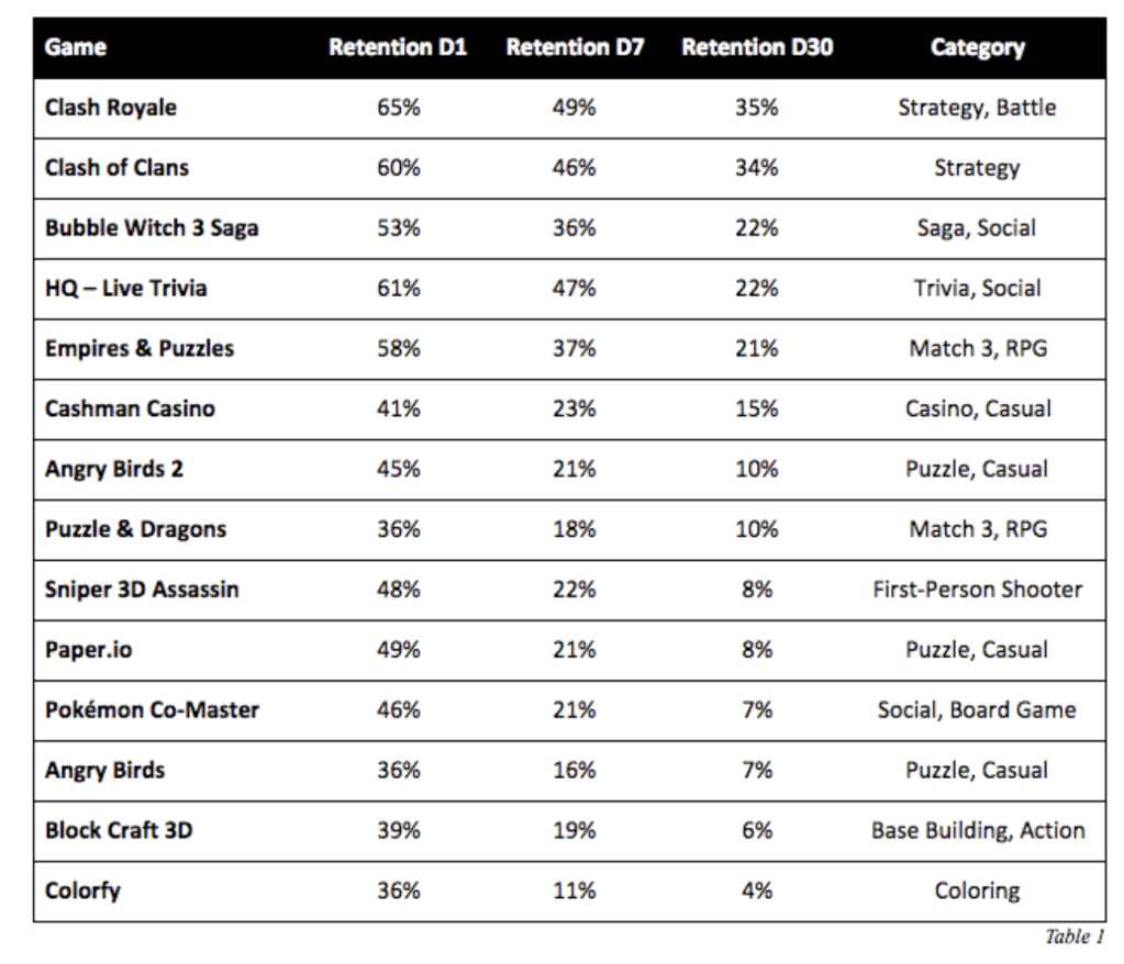 - For Games: D1 retention 25% (top15% >35%), D7 retention 5% (top15% > 14%), D30 retention 1.5% (top15% > 6%)